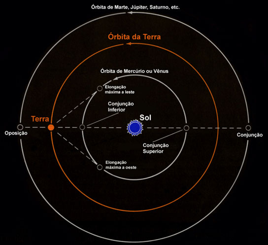 - conjunção inferior: o planeta está na mesma direção do Sol, mais próximo da Terra do que o Sol.
