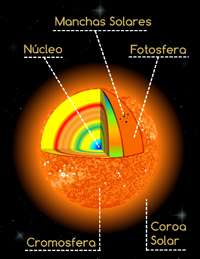 No Sol são consideradas, em geral, seis camadas. Do centro para fora, temos o núcleo, a zona radiativa, a zona convectiva, a fotosfera, a cromosfera e a coroa.